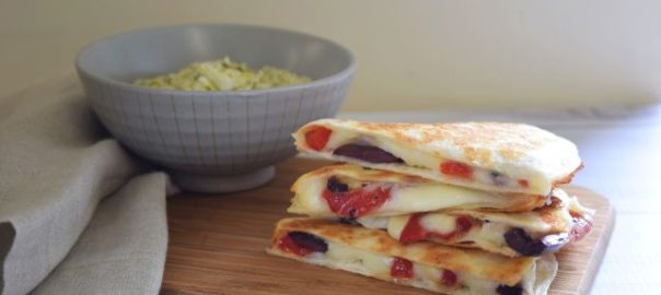 Brush one side of the tortilla with olive oil. On the other side of 2 of the tortillas, place half the cheese, peppers, and olives. Top it with the other tortilla, olive oil side on the outside. Cook each quesadilla on medium-high heat for about 3 minutes or until golden brown in color and cheese is melted. Serve hot with optional pesto sauce on the side.